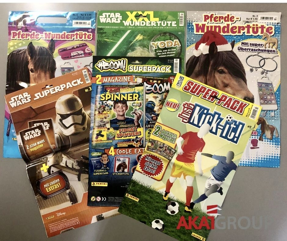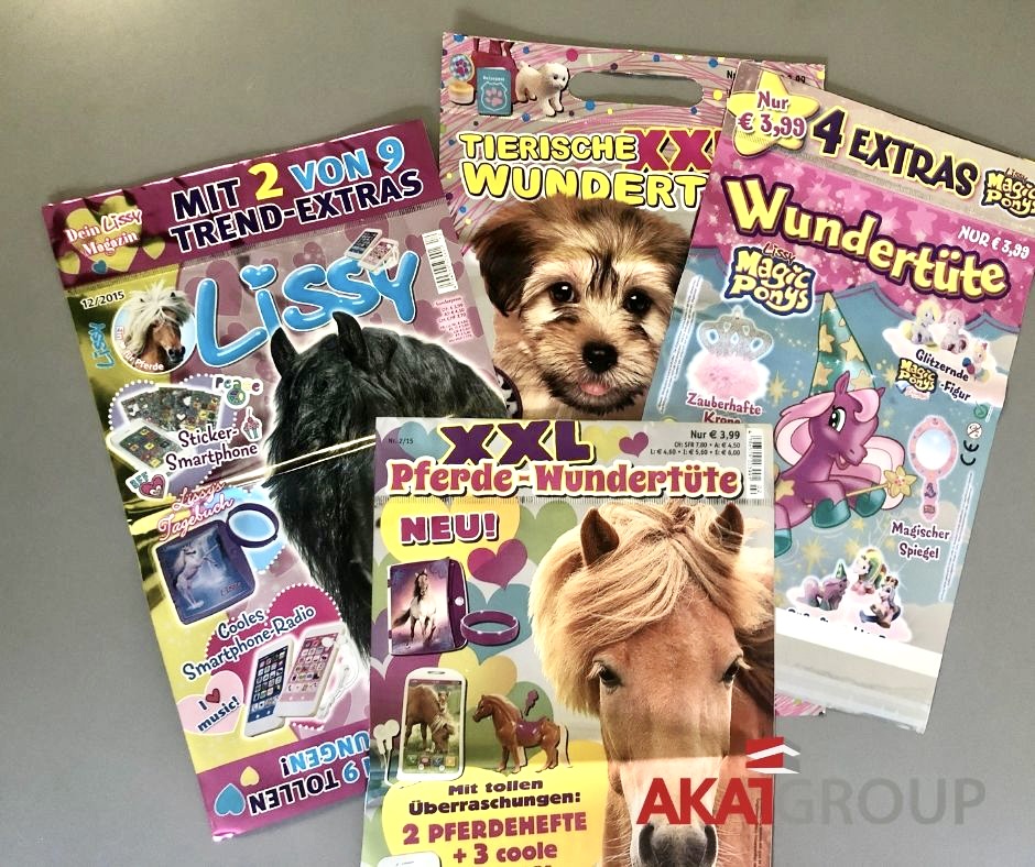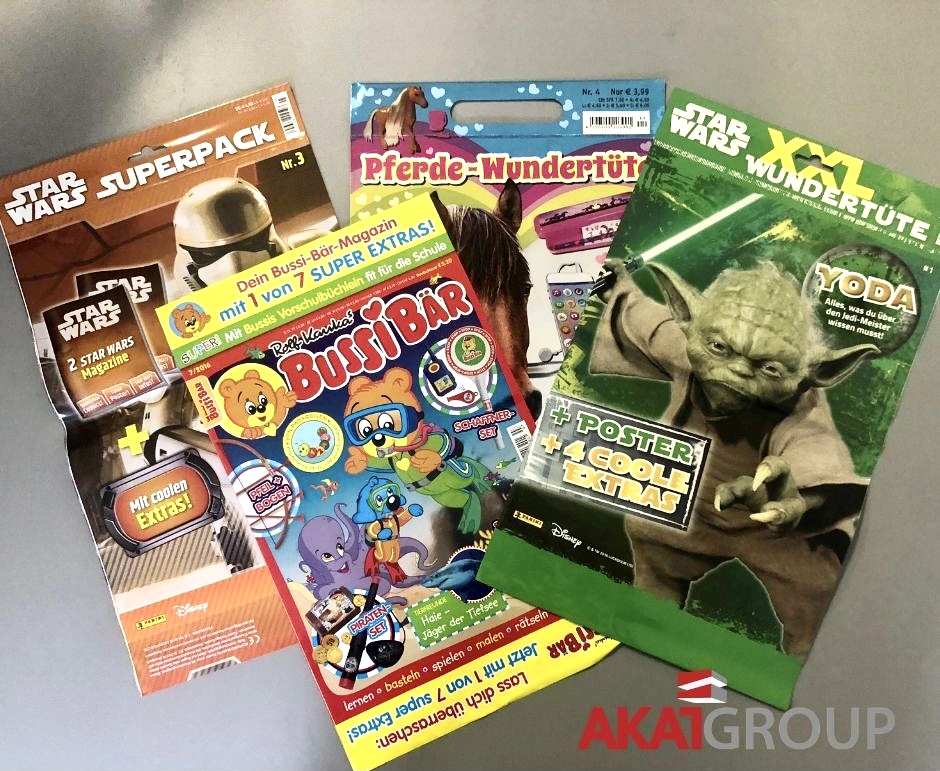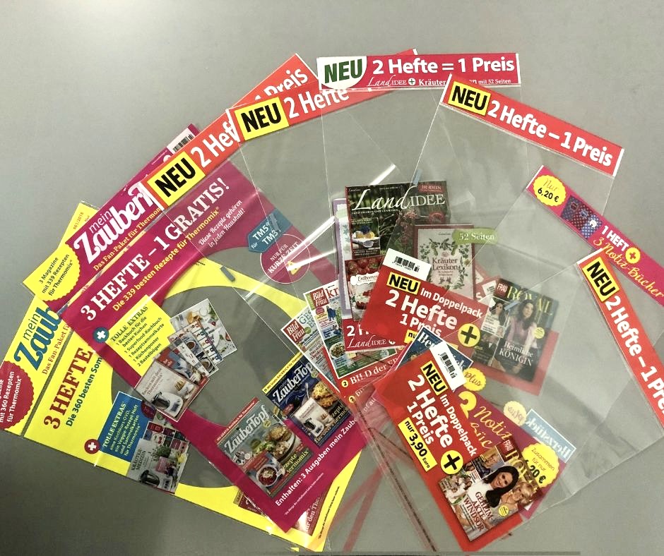 Folienverpackung für Zeitschrift erfüllt vor allem die Vertriebs- und Schutzfunktion für die Ausgabe und für das beigefügte Gratisprodukt. Darüber hinaus, dank dem bedruckten Banner ist das Magazin in dem Zeitungsregal besser sichtbar.